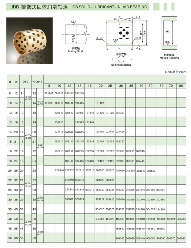 JDB鑲嵌式固體潤滑軸承尺寸表